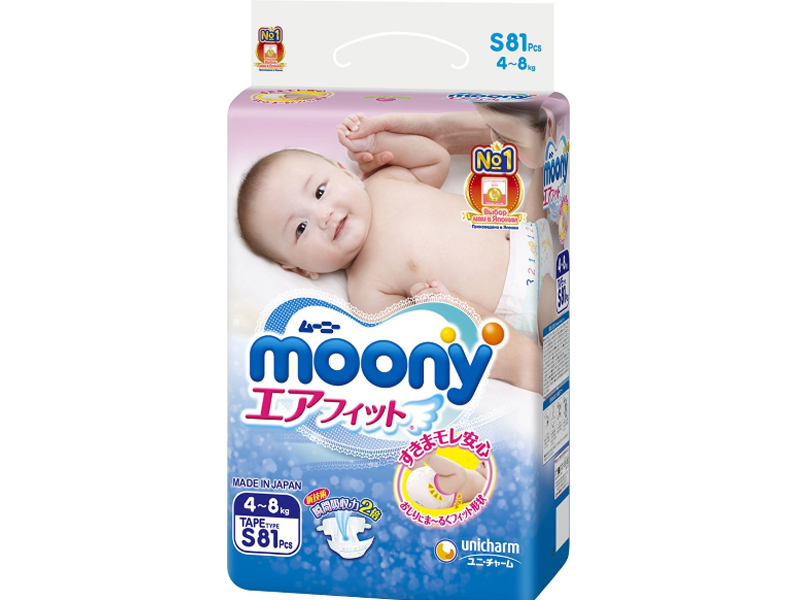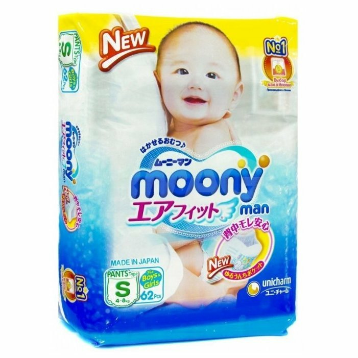 Moony diapers NB (up to 5 kg), S (4-8 kg), M (6-11 kg); panties S (4-8 kg), S / M (5-10 kg)