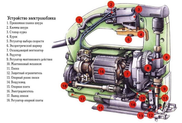 An important element in the construction of an electric jigsaw is the engine. It has the power on which the thickness of the workpiece in processing depends. The lower the power, the less the force with which the file moves along the workpiece.