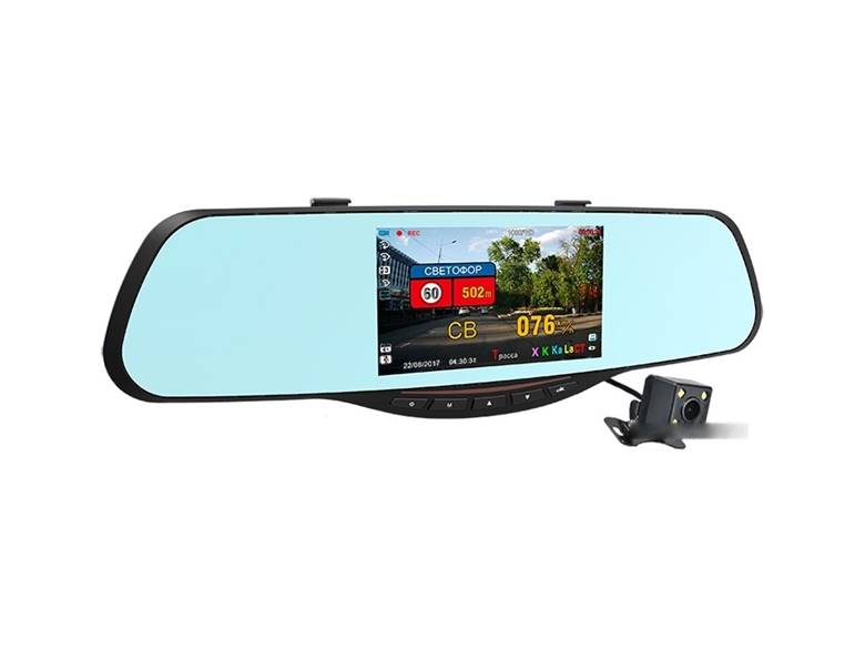 Top DVR completes the budget device, built into the rearview mirror. Conveniently mounted on a mirror and supports memory cards up to 32 GB. Due to its small size and lightness, it holds firmly in place and does not fall off while riding.