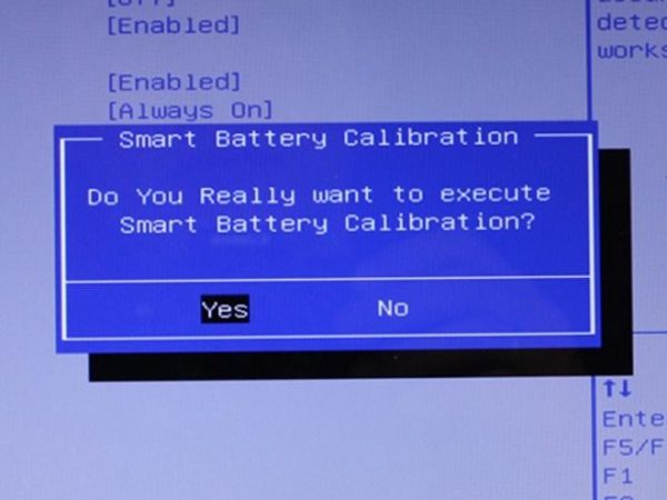 - quindi selezionare "Smart Battery Calibration", dopo l'avvio, sullo schermo verrà visualizzato "Vuoi eseguire la calibrazione della batteria?", fare clic su "Sì" e attendere la fine del processo di calibrazione, utilizzare il tasto "Esc" per uscire da "BIOS".