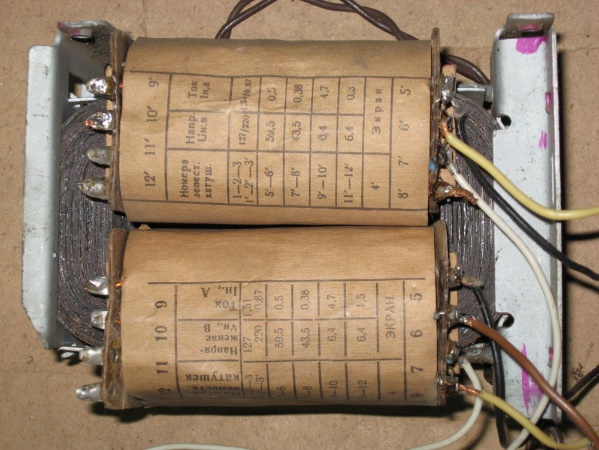 La parte principale del circuito è un trasformatore di potenza, che non può essere trovato ovunque. La sua marcatura: TS-180-2. Un trasformatore di questo tipo ha 2 avvolgimenti, la cui tensione è di 6,4 e 4,7 V. Per ottenere la differenza di potenziale necessaria, questi avvolgimenti devono essere collegati in serie: l'uscita del primo è collegata all'ingresso del secondo mediante saldatura o una morsettiera ordinaria.