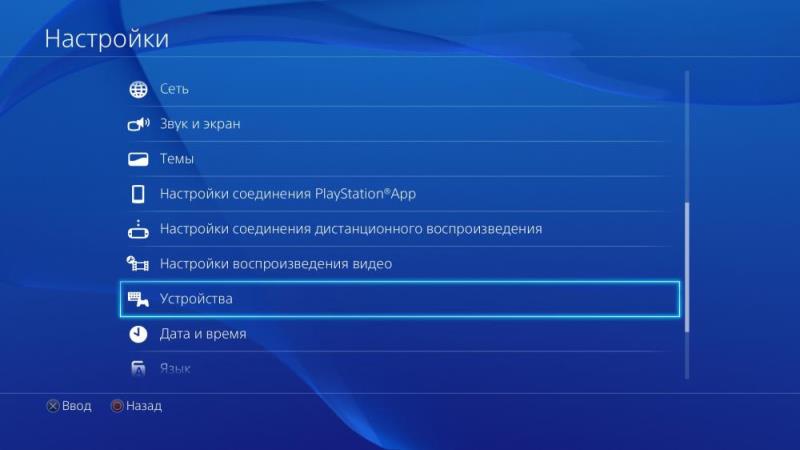 - Vai al menu della console, seleziona la colonna "Impostazioni". In questo elenco, selezionare "Dispositivi" e quindi "Dispositivi audio".