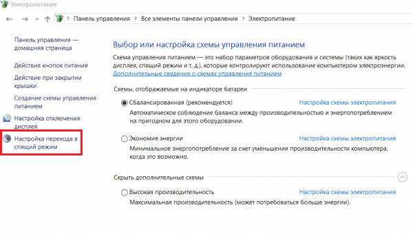 - Per disabilitare la modalità speciale nella parte sinistra di questa finestra, fare clic sul collegamento "Impostazione della transizione alla modalità sospensione".