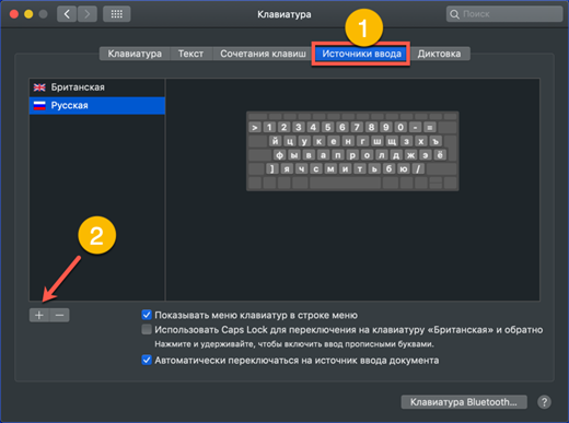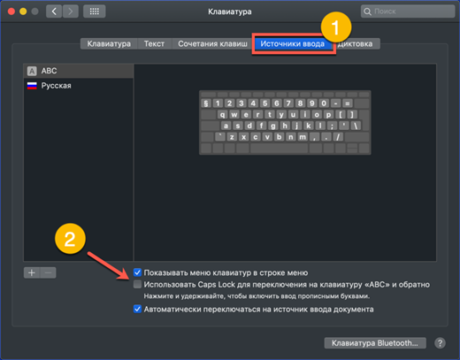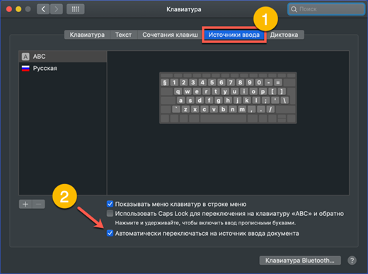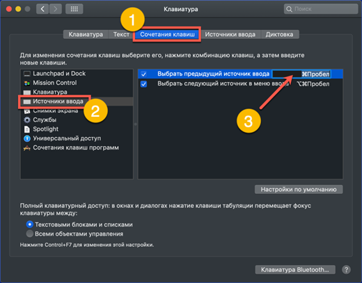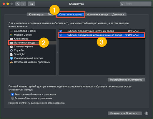 - Dopo aver aperto le impostazioni della tastiera, nel menu in alto della finestra selezioniamo la scheda mostrata dal numero "1". Sul lato sinistro troviamo la sezione "Sorgenti di input". Nella parte destra della finestra, selezionare l'elemento responsabile della modifica della sorgente di input. Cliccando sull'area indicata dalla freccia, si attiva una finestra con una combinazione di tastiera. Lo screenshot mostra come cambiare la combinazione di sistema standard con quella usata in macOS in precedenza.