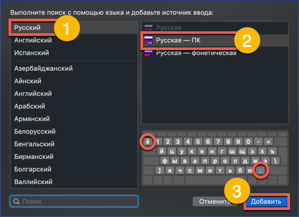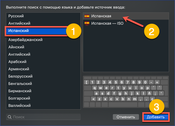 - La parte sinistra della finestra popup elenca i language pack disponibili per l'installazione. Troviamo quello giusto tra loro. Dopo averlo selezionato, sul lato destro vediamo i layout. Indicato dal numero "2" standard per i computer Apple. Lo contrassegniamo e completiamo l'azione facendo clic sul pulsante "Aggiungi".