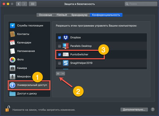 - Nella parte sinistra della finestra, si apre l'area "Accesso universale". I programmi in esso inseriti sono considerati affidabili e sono autorizzati a controllare il computer. Per aggiungere un Punto Switcher è necessario fare clic sull'icona “+” e selezionarlo dall'elenco di quelli installati. L'interruttore opposto all'icona del programma deve essere contrassegnato con un segno di spunta. Pertanto, consentiamo l'avvio automatico all'avvio del sistema operativo e il controllo della commutazione dei layout.