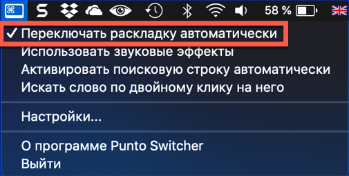 - L'icona Punto Switcher viene visualizzata nella barra dei menu in alto. Cliccandoci sopra, espandiamo le impostazioni di base. Controlliamo che la modalità di commutazione automatica sia attivata.
