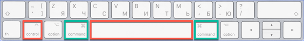 L'uso delle scorciatoie da tastiera è un modo più rapido e conveniente per cambiare layout. Questa opzione è utilizzata dalla maggior parte degli utenti. Su tutti i computer Mac con macOS Sierra o un sistema operativo più recente installato, la combinazione di tasti Control + Spase viene utilizzata per cambiare la lingua di input. Nello screenshot sono indicati in rosso. Nelle versioni precedenti di macOS precedenti al 2016, al posto di Controllo veniva utilizzato il pulsante Comando.