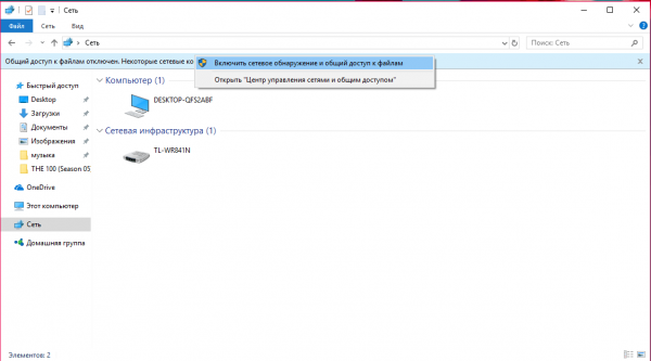 Per aprire l'accesso a tutte le cartelle sul PC, è necessario eseguire nuovamente Esplora risorse. Nel riquadro sinistro della finestra, trova l'opzione "Rete" e fai clic su di essa. Quindi, fai clic sulla striscia con il messaggio che appare. Nell'elenco di 2 opzioni è necessario selezionare "Esegui rilevamento e condivisione della rete".