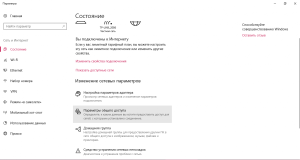 - Immettere il blocco "Rete e Internet" nella finestra "Impostazioni di Windows", che può essere aperta premendo Win + I. Sarà necessaria l'opzione superiore "Stato". Devi scorrere un po 'verso il basso e fare clic sull'opzione "Opzioni di condivisione".