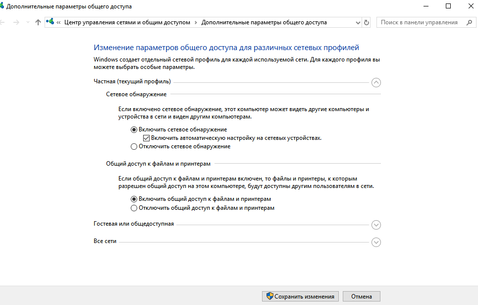 - Nella finestra che si apre, seleziona la casella accanto alle opzioni "Esegui rilevamento rete" e "Apri condivisione". Quindi fare clic su "Salva modifiche" nella parte inferiore della finestra.