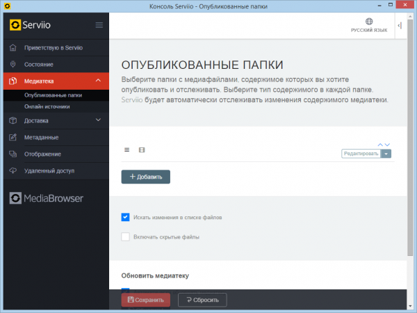 Serviio è un programma molto facile da usare per creare un canale DLNA. Ha un'interfaccia in lingua russa.