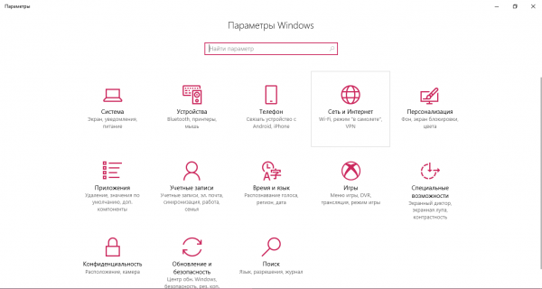 - Sarà necessario configurare un server DLNA sul PC. Premi la combinazione Win + I per aprire la finestra "Impostazioni di Windows". Seleziona il 4 ° quadrato "Rete e Internet".