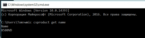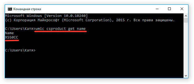Apri la finestra corrispondente, quindi "Avvia", inserisci cmd, attiva. Tramite la sezione "Esegui", confermare l'azione facendo clic su OK. Nella riga di comando che appare, inserisci wmic csproduct get name.