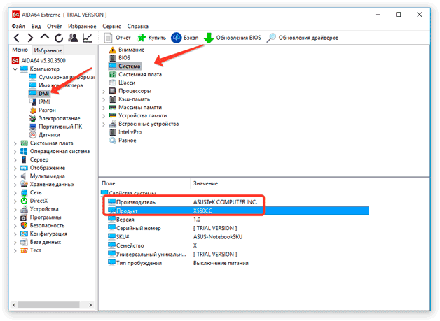 Un elenco dettagliato delle caratteristiche del computer è ottenuto utilizzando programmi di monitoraggio che, dopo aver analizzato il sistema, forniscono tutti i parametri, dal produttore alla temperatura dei singoli elementi. Versione popolare di AIDA64. Qui le informazioni necessarie sono nella finestra DMI, la voce di sistema.