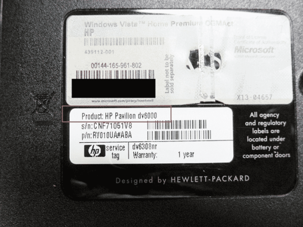 La numerazione della modifica si trova nella parte inferiore del laptop o attorno alla cornice del monitor. L'immagine mostra la parte posteriore approssimativa del laptop Hewlett Packard Pavilion, dove troverai il numero sotto il logo del produttore.