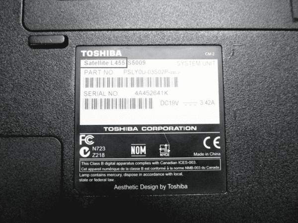 L'identificazione dei laptop è una delle più semplici. Tutte le modifiche sono dotate di marcature nella parte inferiore della custodia nel formato tradizionale. Il numero è combinato da lettere e numeri. La designazione verbale più popolare è Satellite. Dopo arriva una combinazione del tipo L455-S5009. Il carico principale della gamma di modelli è la prima lettera e la serie di numeri dopo di essa (nella foto).