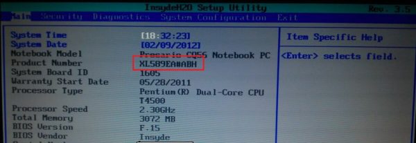 Se i metodi di verifica indicati non sono disponibili, è possibile trovare il modello di laptop nel BIOS. Dopo aver acceso il dispositivo, premere immediatamente F2, Tab, Elimina, in attesa della visualizzazione del menu BIOS. Il numero seriale e il modello sono elencati nella sezione Informazioni. In inglese, apparirà così: Principale (Informazioni sul sistema) - Nome del prodotto (Numero). Sull'ultima riga, verrà visualizzata una modifica del laptop.