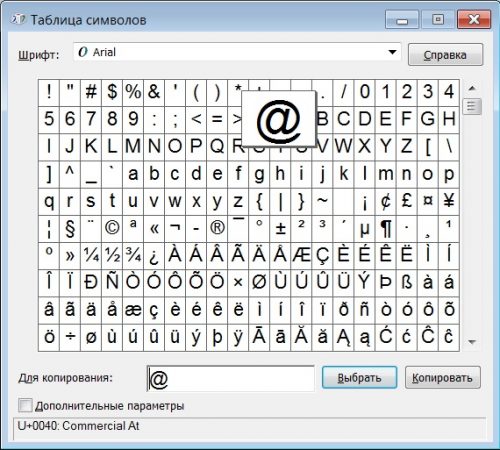 Se i due metodi sopra descritti non funzionano per te, vai al terzo. Consiste nell'uso di una tabella di Windows. Per aprirlo, devi andare nel menu "Start", selezionare lì i programmi standard, trovare quelli di utilità, dove si trova la tabella. Ci sarà sicuramente un'icona "cane" nell'elenco, che puoi facilmente copiare e incollare nel tuo testo o indirizzo. Per fare ciò, selezionare il segno: apparirà nel campo sottostante e accanto a fare clic sul pulsante "Copia". Ora apri il tuo documento o la tua pagina web e incolla @.