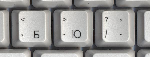 Se stampi in russo, quindi per dirlo, è sufficiente prestare attenzione al pulsante situato vicino alla lettera Yu. Fai semplicemente clic sul pulsante e alla fine avrai il segno di punteggiatura corrispondente.