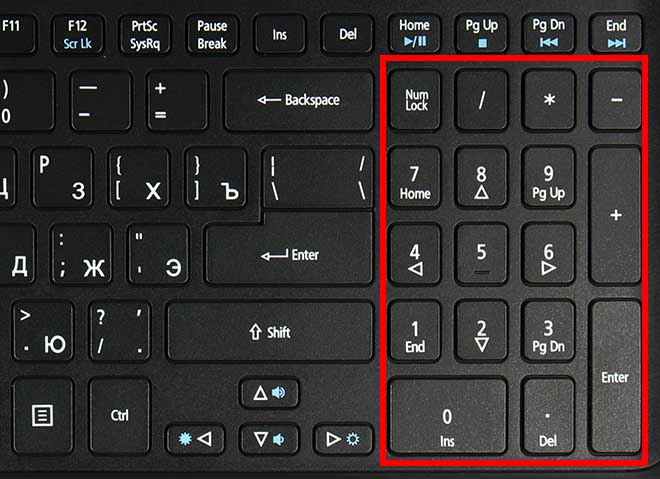 Il layout digitale consente di mettere questa icona, se per qualche motivo quella principale non funziona. Per usarlo, devi prima accenderlo. Per fare ciò, fai clic sul pulsante Bloc Num. Quindi, per inserire un carattere che termina la frase, vai in una lingua straniera e premi il tasto a sinistra di Invio - il pulsante Canc. Lei in inglese mette solo ciò di cui abbiamo bisogno.
