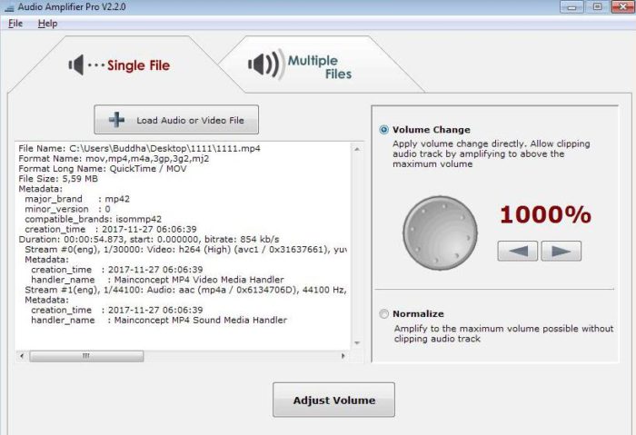- L'amplificatore audio è uno dei programmi più diffusi per regolare la qualità del suono. Per effettuare le regolazioni, è necessario utilizzare Carica file e spostare il dispositivo di scorrimento nella posizione desiderata. Di conseguenza, salva nuovi dati.