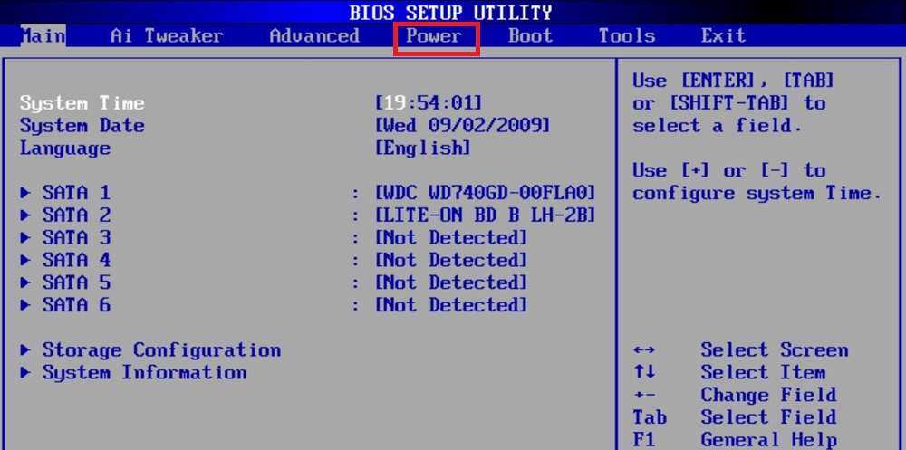 Dopo aver verificato i processi, si consiglia di riavviare il laptop, quindi accedere al sistema BIOS (nella maggior parte dei dispositivi, i pulsanti F9, F11). Quindi vai alla sezione "Potenza".