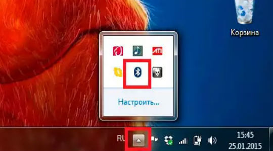 - Accanto alla barra della lingua troviamo l'icona a forma di triangolo e fai clic su di essa. Nel modulo avviato, troviamo l'icona Bluetooth blu e facciamo clic su di essa.