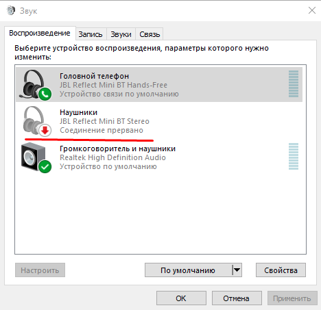 Nel secondo caso (quando il sistema ha commutato erroneamente il dispositivo di riproduzione), è necessario selezionare l'icona del mixer dei componenti audio in basso a destra e fare clic su di esso con il mouse. Fare clic sulla scheda "Dispositivi di riproduzione", contrassegnare l'apparecchiatura wireless e accenderla utilizzando il menu. In caso di successo, dovrebbe apparire un segno di spunta verde.