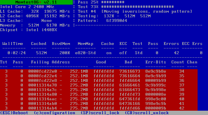 Puoi controllare la RAM scaricando il programma memtest86 + gratuito dal sito ufficiale. Dopo il download, è necessario creare un'immagine flash o CD. È quindi possibile eseguire l'utilità decomprimendo i dati dall'immagine o avviandoli direttamente tramite il BIOS. Durante il test, lo schermo mostrerà: