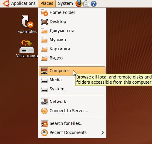 Per la diagnostica, è necessario utilizzare l'utilità Ubuntu. Prima di iniziare il test, è necessario scrivere l'immagine di distribuzione sul disco. Quindi scaricare il programma dal disco senza installarlo sul laptop. Successivamente, nella finestra che si apre, devi inserire Luoghi e selezionare Computer.
