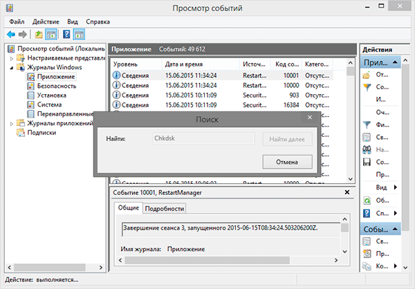 - Se la finestra di dialogo non viene visualizzata, il risultato del test può essere visualizzato nei registri: Registri di Windows / Applicazione / Ricerca, immettere Chkdsk.