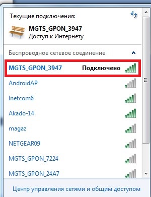 Il Wi-Fi viene avviato premendo un interruttore o spostandolo in una posizione specifica. Se tutto è in ordine, viene visualizzato un segno di connessione wireless sotto forma di passaggi. Cliccandoci sopra, puoi aprire una finestra in cui verrà indicata la connessione corrente: