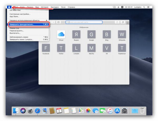 - Programmi sospesi, processi. Anche una ragione abbastanza comune. Per risolvere il problema, è necessario forzare la chiusura dell'applicazione, terminare i processi. Per fare ciò, fai clic sull'icona "Apple" nell'angolo in alto a sinistra e seleziona "Forza Forza Fine".