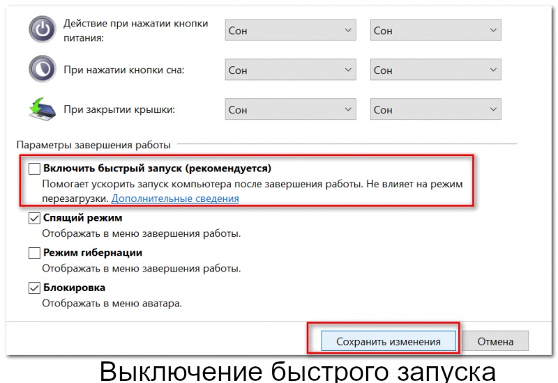 Quando si utilizza il sistema versione 10 di Microsoft, non esiste tale voce nel menu. Invece, usa le "Opzioni". Nel caso degli otto, la voce "Potenza" sarà interessante, ma tra le prime dieci in "Impostazioni di Windows" vanno al punto "Sistema", in cui selezionano "Modalità di alimentazione e sospensione" e già in "Impostazioni avanzate di potenza". Inoltre, tutte le azioni vengono eseguite allo stesso modo in tutte e tre. A sinistra, selezionare "Funzionamento pulsante di accensione". Qui, il segno di spunta viene rimosso con "Abilita avvio rapido (consigliato)". Premi "Salva": tutto, l'avvio rapido è disabilitato. È possibile sovraccaricare il laptop e accedere al BIOS.