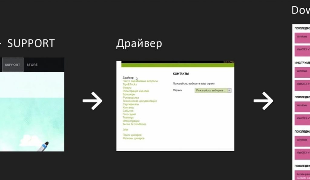 Una versione aggiornata dei driver è disponibile sul sito Web del produttore su Internet e può essere scaricata. Il produttore ha un sito Web www.wacom.com dove è necessario trovare il pulsante di supporto. Appena sotto la barra di ricerca, nella pagina con la barra di navigazione, ci sono diverse finestre, la prima delle quali si chiama driver. Andiamo nella finestra dei driver, dove puoi trovare non solo gli aggiornamenti del nuovo 2018, ma anche i driver per i modelli precedenti. Quindi è necessario selezionare il sistema operativo e il modello del dispositivo, che viene scaricato facendo clic sul pulsante di download, quindi i driver aggiornati verranno scaricati sul dispositivo, che verranno installati ulteriormente secondo le istruzioni.