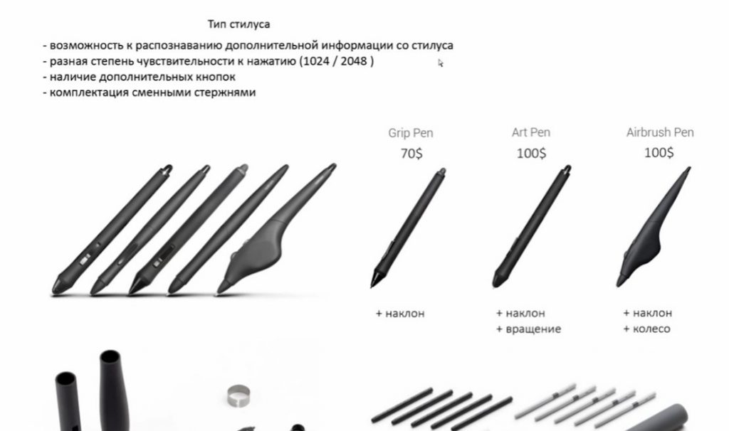 Le stilo per il disegno hanno diversi livelli di sensibilità. Una penna più semplice distingue solo diversi gradi di pressatura, gli accessori costosi si sentono meglio, possono trasmettere inclinazione e rotazione, trasmettere l'effetto naturale dei pennelli per la pittura. Piume così complesse sono più costose. Il retro della penna ha un pulsante che funziona come una gomma. È importante ricordare che per spostare la penna in un'altra parte dell'immagine, non è possibile spostare la penna senza alzare lo sguardo dallo schermo, quindi i tratti verranno ottenuti nello stesso punto. Per ottenere il movimento, deve esserci una distanza, ma non più di 16 mm.