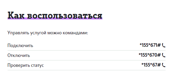 | Titolo | La quantità di traffico, GB. | Costo, sfregamento / mese | Comando di attivazione |