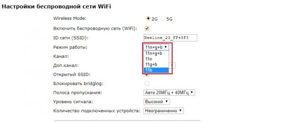 La modalità di funzionamento WLAN è divisa in quattro tipi: "b / g / n / ac". Il più preferito è "802.11n + g + b". Fornisce la massima velocità di trasferimento dei dati. In questo caso, l'errore sta nel fatto che router e tablet hanno modalità diverse. Semplicemente non sono definiti, quindi l'accesso alla rete non è possibile.
