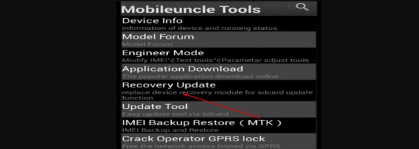 - Apri il menu principale dell'utility Mobileuncle installata, trova il file di ripristino.