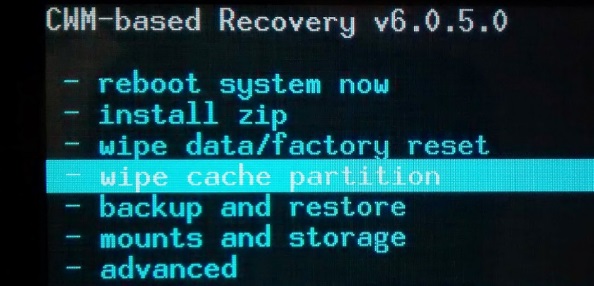 Menu principale di ripristino e l'opzione "wipe cash partition", che è responsabile della cancellazione di tutti i file accumulati temporanei