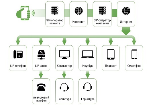 Anna compose un numero russo nel programma. Il server Sip a cui è collegato il suo smartphone sta cercando nella rete globale il server in cui è registrato il "numero" di questa azienda russa. Il server di destinazione risponde e si connette dopo lo scambio di indirizzi IP. Nel processo di comunicazione, i "messaggi vocali" Anne vengono compressi, crittografati e compressi vengono trasmessi al server dell'interlocutore, che a sua volta decodifica il messaggio e lo riproduce in qualità analogica.