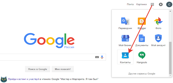 - Nella parte superiore, fai clic sull'elenco di tutte le applicazioni del servizio (caselle), scorri e trova i tuoi contatti.