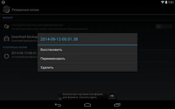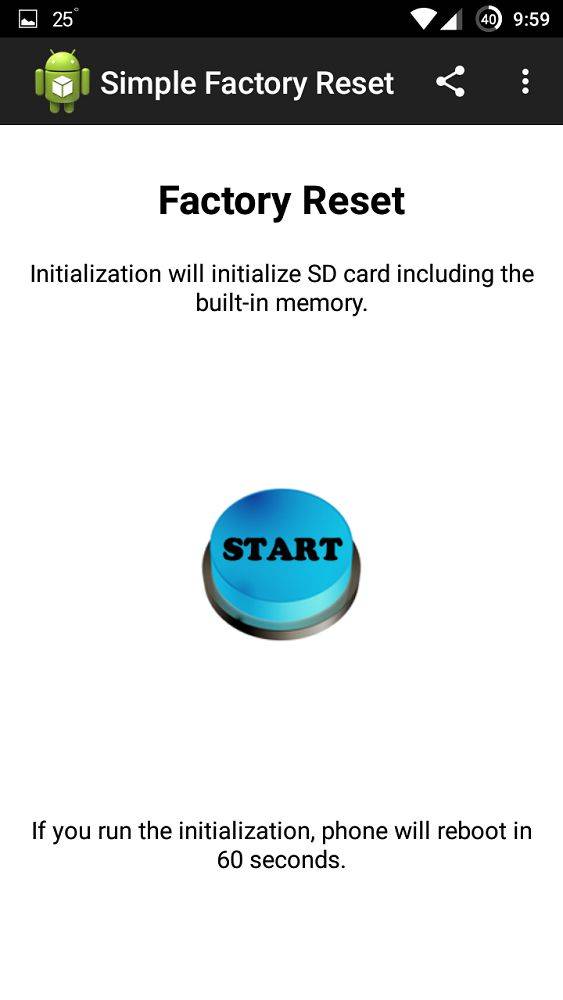 - "Ripristino semplice del telefono di fabbrica." Questo programma può essere scaricato da Play Market. Avvia un rollback automatico alle impostazioni di fabbrica. Dopo che il programma è stato scaricato e installato, è necessario avviarlo e fare clic sul pulsante "Start" nella schermata principale. Il vantaggio principale di questo software è che l'utilità può eliminare singoli file e applicazioni.