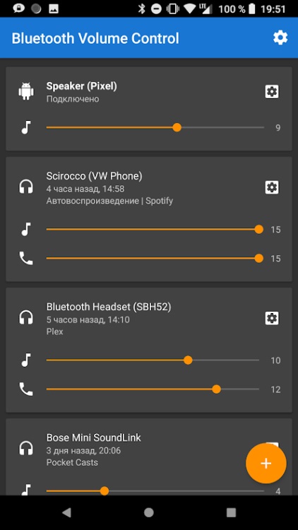 Il nome dell'applicazione rivoluzionaria è Bluetooth Volume Control. La stragrande maggioranza dei moderni smartphone si basa su una base di controllo di 4.2 e versioni successive. Il programma è disponibile per quegli utenti per i quali la versione di Android inizia con 4.4. Oltre al volume dei file audio, è possibile regolare il livello audio delle chiamate dei singoli abbonati. BVC controlla in modo indipendente e mostra all'utente l'ora dell'ultima voce sullo schermo.