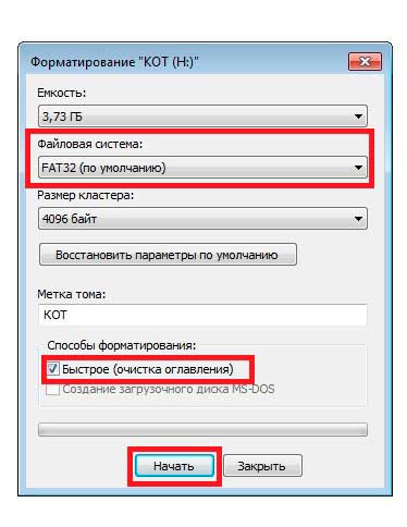 - Il prossimo passo sarà selezionare un file system. Sono disponibili due opzioni: "FAT" o "NTFS". La maggior parte delle carte ha il formato predefinito - "FAT", tuttavia, se la formattazione per questo tipo non ha risolto l'errore, dovresti provare a scegliere un altro tipo - "NTFS".Ecco come dovrebbe apparire: