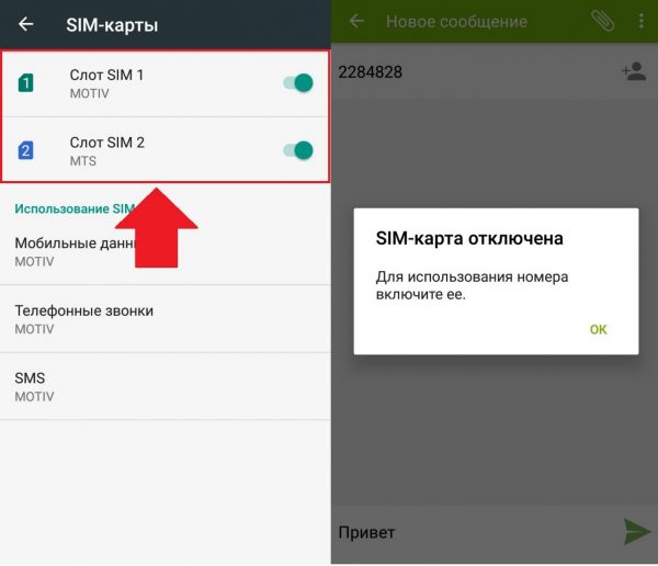 I mezzi di comunicazione bidirezionale stanno diventando sempre più diffusi. In tali dispositivi, di solito viene fornita la possibilità di disattivare una determinata carta. Prova a cercare questa opzione in impostazioni del telefonotuttavia, se non riesci a trovarlo, vai ai messaggi e invia SMS con qualsiasi testo a qualsiasi numero. Se il problema è che la carta SIM è spenta, il dispositivo suggerirà di accenderla.