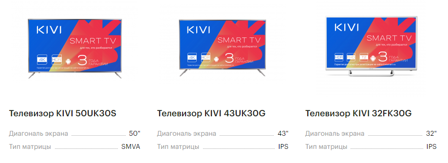 I TV KIVI hanno una diagonale diversa. Quindi, se hai bisogno di un piccolo modello per la cucina, puoi prendere un dispositivo con una diagonale di 24 pollici. Vuoi avere un home cinema completo? In questo caso, scegli una TV da 65 pollici. La tecnica è presentata in diversi colori.