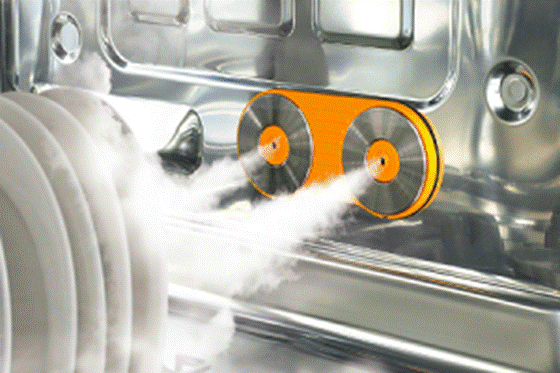 - Nell'ultima fase, i piatti vengono elaborati con acqua calda. La lavorazione viene eseguita con un additivo in grado di ridurre la tensione superficiale dell'acqua.