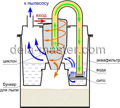L'unica differenza è solo nello stato fisico del contenuto del contenitore della polvere. A aspirapolvere con un filtro acqua il sedimento sporco è allo stato liquefatto. Negli apparecchi a ciclone, tutta la polvere è in forma secca.